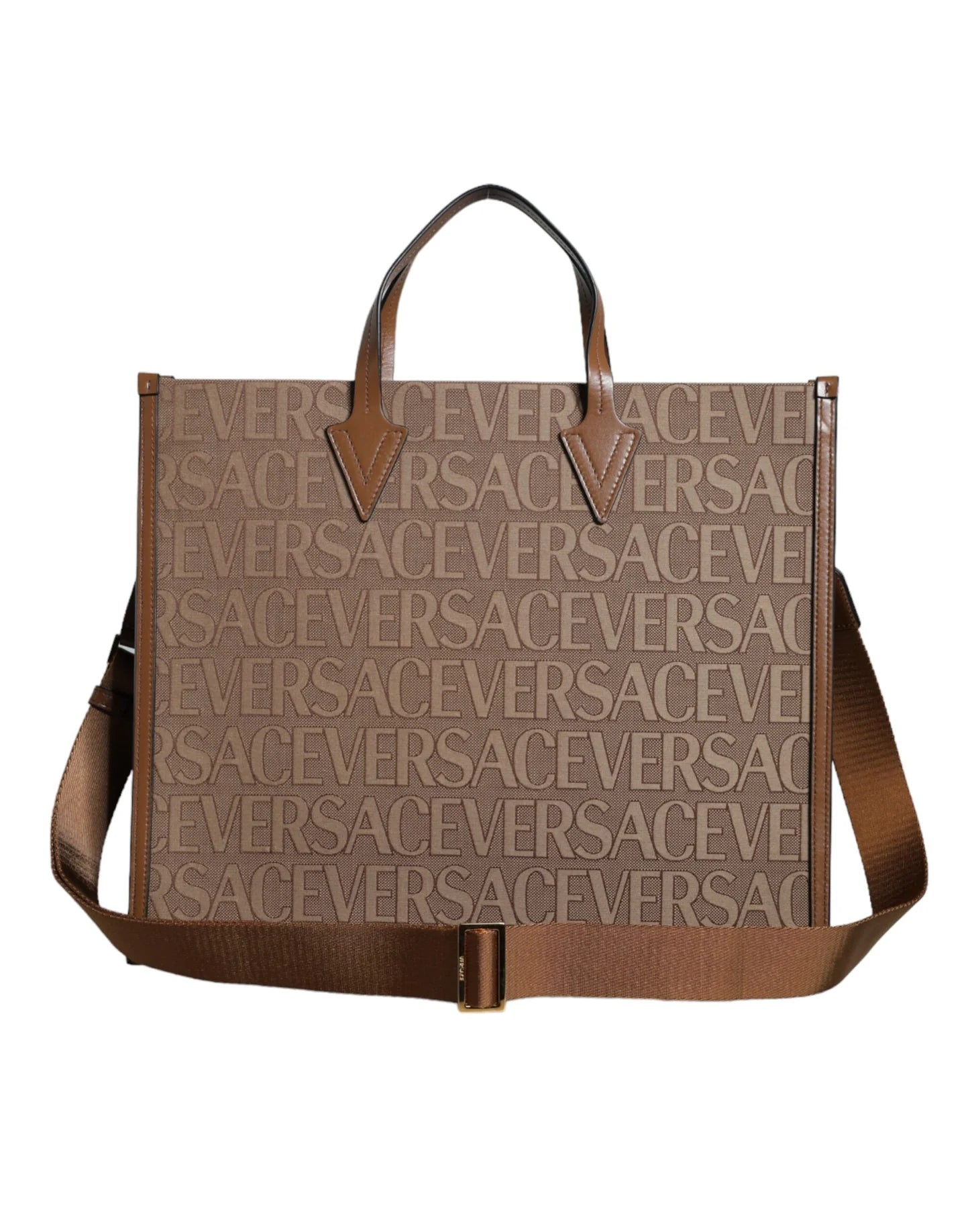 Jacquard logo tote with leather trims and detachable crossbody strap.